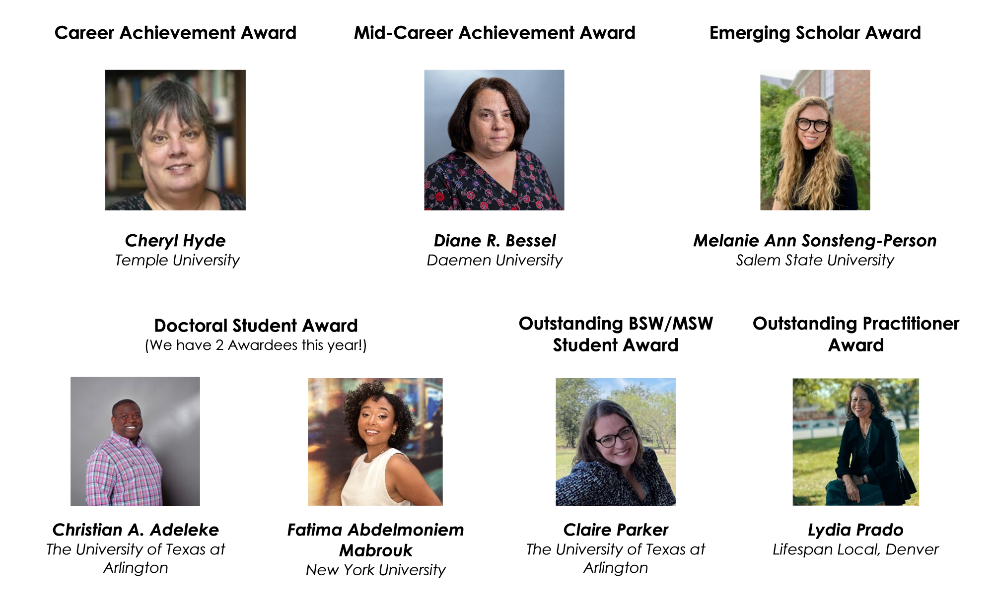 The awardees represent meritorious contributions to macro practice, including researchers and practitioners, across various settings and career stages.